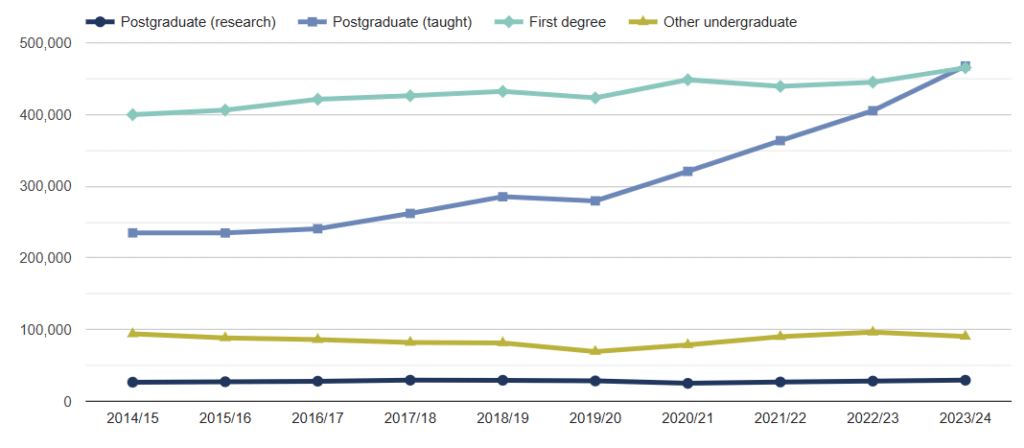 - The number of postgraduate taught qualifications obtained has increased markedly since 2019/20, rising by 15% between 2022/23 and 2023/24. Postgraduate taught qualifications became the most awarded qualification in 2023/24, surpassing first degrees for the first time since our records began.